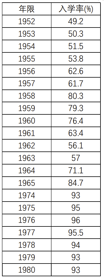 新中国成立后小学入学率便由民国时期的23%,大升至1952年的49.2%,在大跃进开始时更在毛泽东大力鼓吹“开门办学”及办学权力下放下, 由1957年的61.7%大增至1958年的80.3%。后来随着大跃进的失败,毛泽东退居二线,教育政策亦随之改变。小学入学率便跌至1962年的56.1%。在文革前,随着毛泽东重新掌权,1964年小学入学率便提升至71.1%,1976年则达96%。(表一)