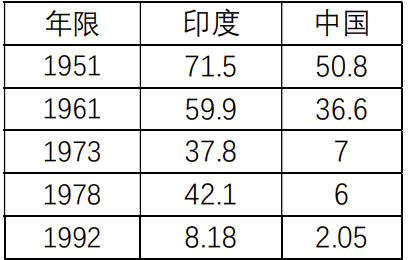 众多研究表明, 关键就是因为印度独立后把大量教育资源投放在高等教育, 而忽视基础教育、扫盲等。表三显示印度在50、60、70年代小学入学率都远低于中国。而中国更是在60及70年代小学入学率大大抛离印度。