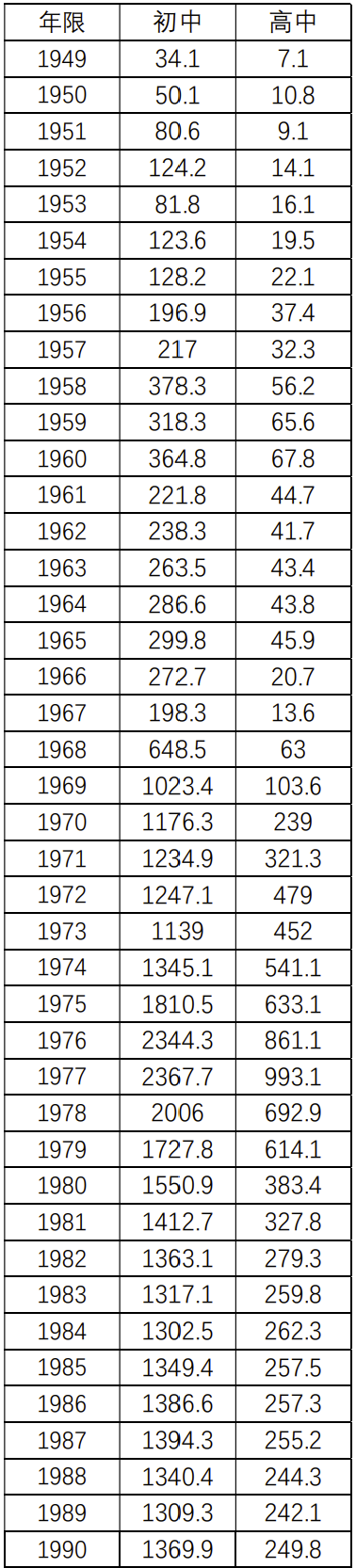 表四: 中国普通中学招生统计表 招生数(万人) (来源:中国教育大事典1949-1990, p337,338. 刘英杰主编,浙江教育出版社)