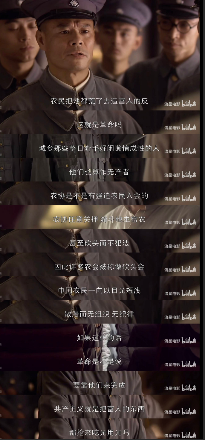 土豪劣绅随意杀农民而不犯法,现在出现了农民杀地主的事情,自然也就不奇怪。而且,农民也并非任意游斗和关押,随便杀地主而不犯法。他们从地主那里学了很多从前地主劣绅对付农民的办法,比如有清算,罚款,质问,捐款,游行示威等等,都是从土豪劣绅那里学来的。他们根据土豪劣势所犯的具体事情而采用不同的惩办方式。然而这里面却有一个最重要的区别,那就是农民惩办地主,需要农民公审大会,需要大家提供他们从前欺压农民的材料,需要公开处理。而以前不法地主和土豪劣绅则不需要,他们可以私设刑堂,他们那个才是真正的杀农民而不犯法。这里我们还不去讨论,那个所谓的地主的“法”,到底是维护地主还是维护农民这样的问题了。“中国农民一向以目光短浅,散漫而无组织无纪律,如果是这样的话,革命是不是说,要靠他们来完成?”没有组织起来的农民,确实存在着各种散漫、落后、愚昧、迷信等等现象,鲁迅笔下就刻画过很多这类人物。然而这些现象是谁造成的?生活在那样落后的生产关系下,在那样残酷的地主剥削条件下,谁不愚昧?谁不落后?不正是因为这样,所以农民才需要组织起来闹革命,扫除那种封建土地关系吗?在农会起来之前,农村毫无希望,国家毫无希望,而农民起来之后,他们不但自己在克服自己的种种缺点,而且他们组织清盗匪、禁大烟、废苛捐、办学校、修路引水、搞合作社、废除神权压迫、推翻土豪劣绅、发展农业生产,这些事情,哪一项不是农民干出来的?孙中山先生致力国民革命凡四十年,所要做而没有做到的事,农民在几个月内做到了。这是四十年乃至几千年未曾成就过的奇勋。什么是富人的东西?土地生来就是富人的吗?一个国家的土地、水、空气、自然资源一开始就都是富人的吗?那些他们所占有的财富、土地、房屋、资产,哪一项不是劳动人民创造出来的?劳动人民创造了这些东西,然后这些东西又都到了富人那里,所以到底是谁抢了谁?连土匪都知道地主、资本家是在抢,只不过抢的方式不同,黄埔军校的学生却不知道到底是谁在抢谁吗?农民因为无力维持耕种而破产,工业因为无力组织而不发展,帝国列强跑来抢矿山、抢资源而无力抵御,这不是联合列强一起吃光用光吗?他们不但吃现在,而且还吃未来,看看农民和工人,他们身上背着的高利贷要还多少年?各地军阀政客们的税收,都收到多少年以后了?未来几十年上百年都被他们提前吃下去了,所以到底是谁在吃光用光?农民拿回地主的地,迅速就恢复和组织生产,他们在农村搞了十四件大事,哪一件不是有利于恢复生产,这能叫吃光用光吗?就是要消灭人吃人的社会制度,要消灭人吃人,就要消灭私有制,要消灭私有制,靠地主和资本家是绝无可能的,要靠受压迫的劳动人民,因此要革命,要建立一个无产阶级专政的国家。经过这样一个无产阶级专政的过程,最后走向共产主义。共产主义可能很远,但是消灭人吃人的每一步,却就在我们当下。好了,以上就是借用《湖南农民运动考察报告》的内容,然后用自己的话回答的剧中的几个问题。为什么要回答这几个问题,因为它不单单是一个过去的历史问题,它代表着很多人对革命这个问题本身的认识。如果把过去历史上的那次湖南农运,用一种高级的手法传递给今天的观众一个“糟糕的”、“破坏的”、“混乱的”印象,那么这就会使得一些人认为,似乎革命运动本身都只有糟糕、破坏和混乱的一面。其主题所指,自然不言而喻。就是我们假设当时没有这篇调查报告,又或者当时的新民主主义革命失败了,因而这篇调查报告便不可能被国民党发表。这样一来,同样是那样一场湖南农民轰轰烈烈的农民运动,到了国民党的教材里,它又会被以怎样的方式去描绘呢?